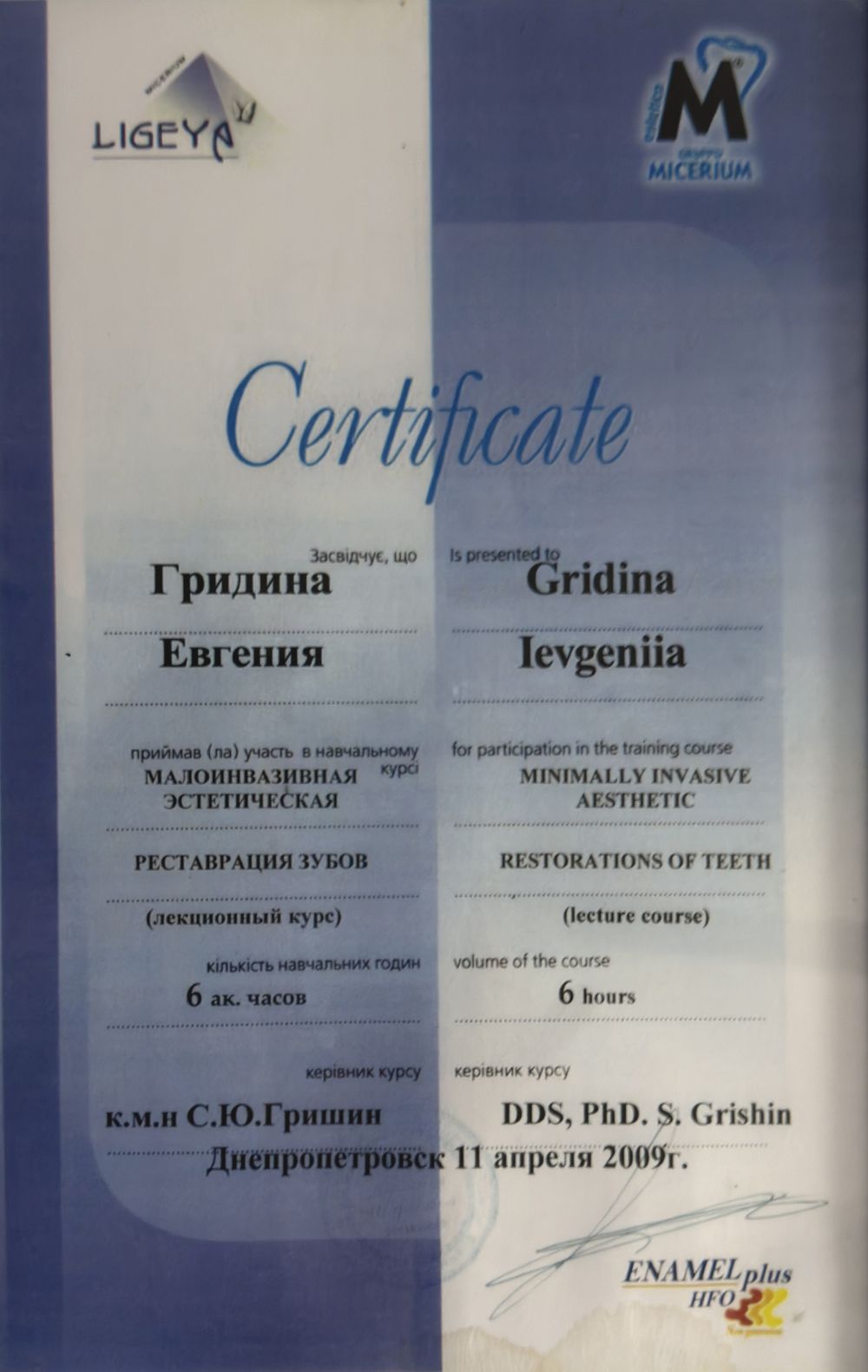 • 2009 рік “Малоінвазивна естетична реставрація зубів”, м. Дніпропетровськ